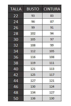 La siguiente tabla no muestra las medidas reales del producto, más bien, sirve de referencia para seleccionar su talla conforme las medidas de usted como consumidor.